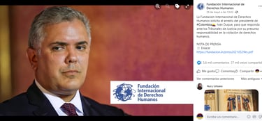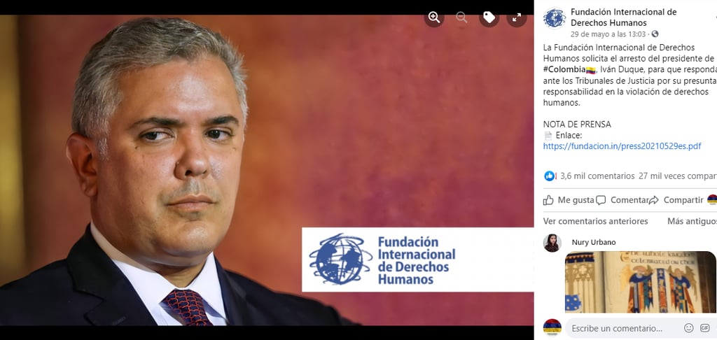 Desde la semana pasada está circulando una publicación en Facebook de la Fundación Internacional de Derechos Humanos en la que solicita arresta al presidente de Iván Duque para que “responda ante los Tribunales de Justicia por su presunta responsabilidad en la violación de derechos humanos”.