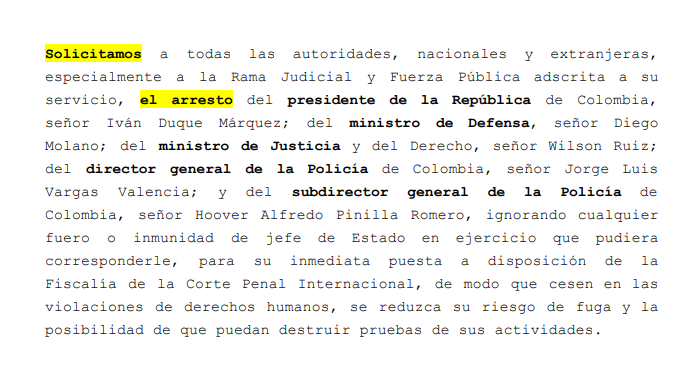 También pide a la Rama Judicial y la Fuerza Pública colombiana que los arresten e ignoren el principio de inmunidad de los Jefes de Estado para que la investigación sea efectiva, no se eliminen pruebas y se disminuya el riesgo de fuga.
