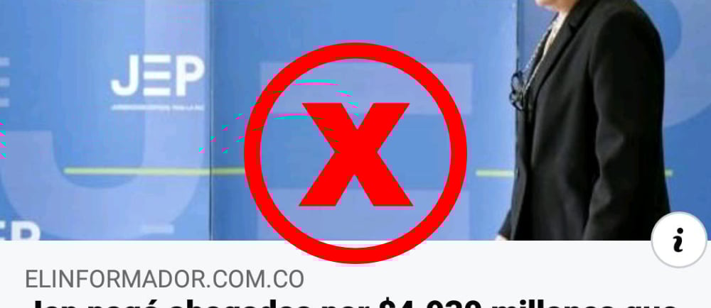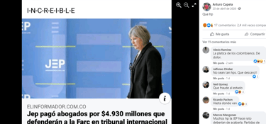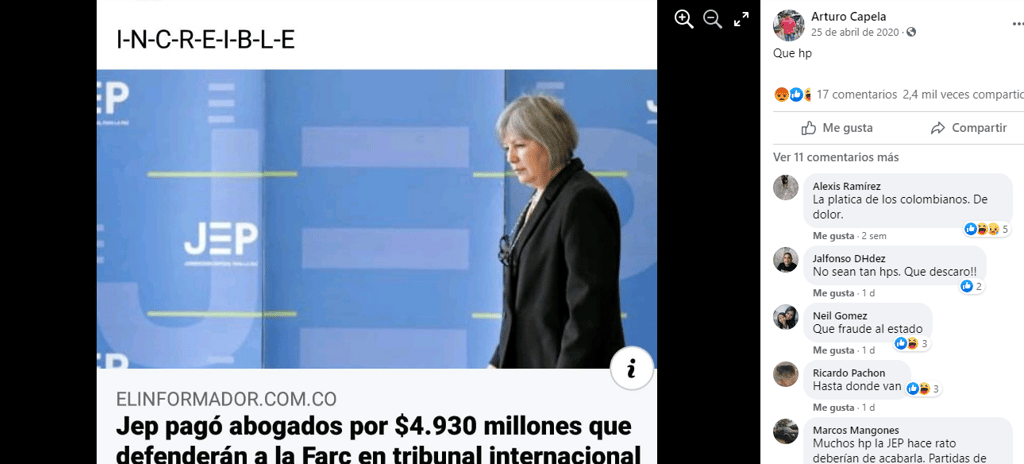 El tribunal de la OEI no existe. Otra vez está circulando la captura de un artículo, publicada por el usuario Arturo Capela, en la que el portal ElInformador.com.co dice que la JEP pagó 4,930 millones de pesos a abogados para que defendieran a las Farc ante un tribunal internacional.