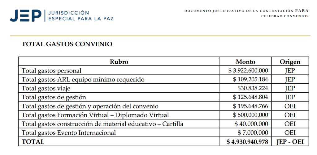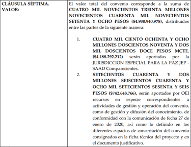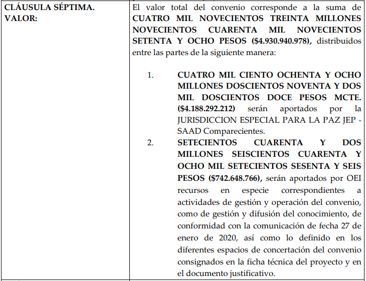 Además, la JEP pagó la mayoría pero no todo el monto del convenio, como dicen el ‘El Informador’ y ‘El Expediente’. Eso porque como pasa en cualquier convenio cada parte pone un pedazo de su costo. En este caso, la OEI aportó $742,648,766: